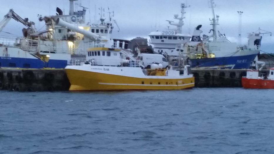 Finnbjörn ÍS kominn á flot við bryggju á Akranesi. Myndi Elli bjössi Halldórsson