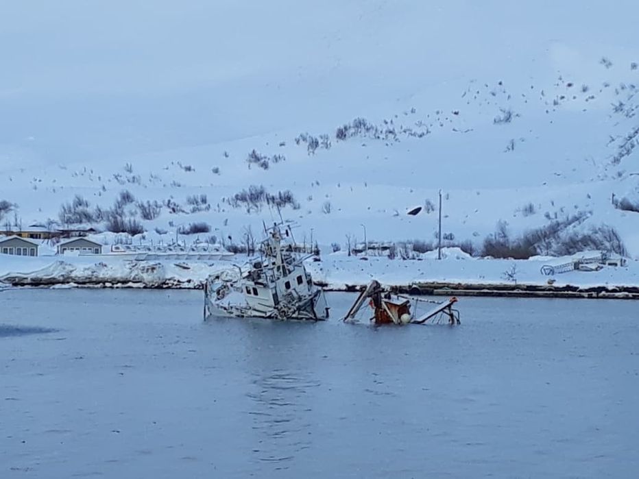 Guðjón Arnar ÍS liggur bak við Orra ÍS og liggur þar á hliðinni á botninum á 5 metra dýpi,