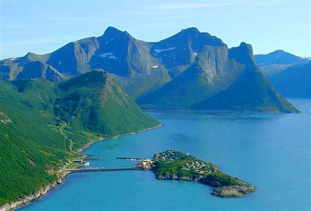 Husöy, eyjan til hægri sem er tengd með vegi í land.