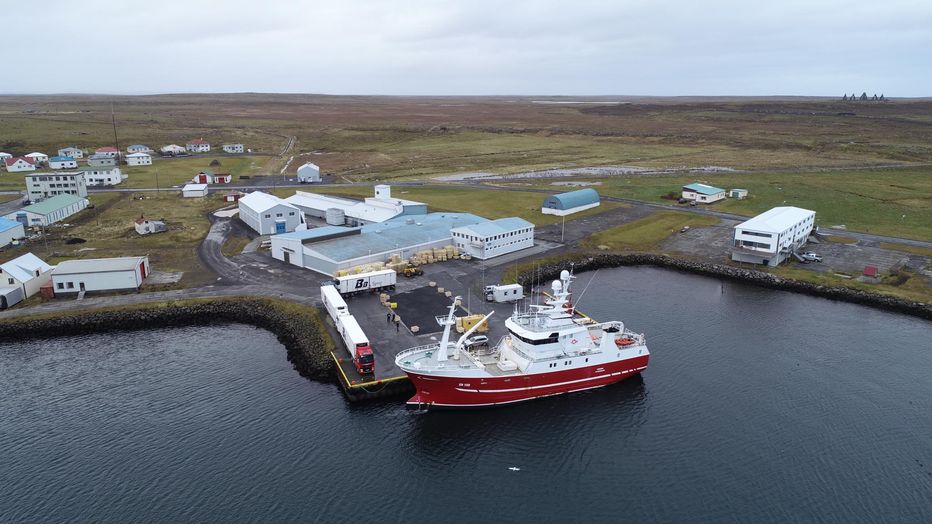 Þórsnes SH á Raufarhöfn í október árið 2018, þrír trukkar frá BB bíða á bryggjunni,