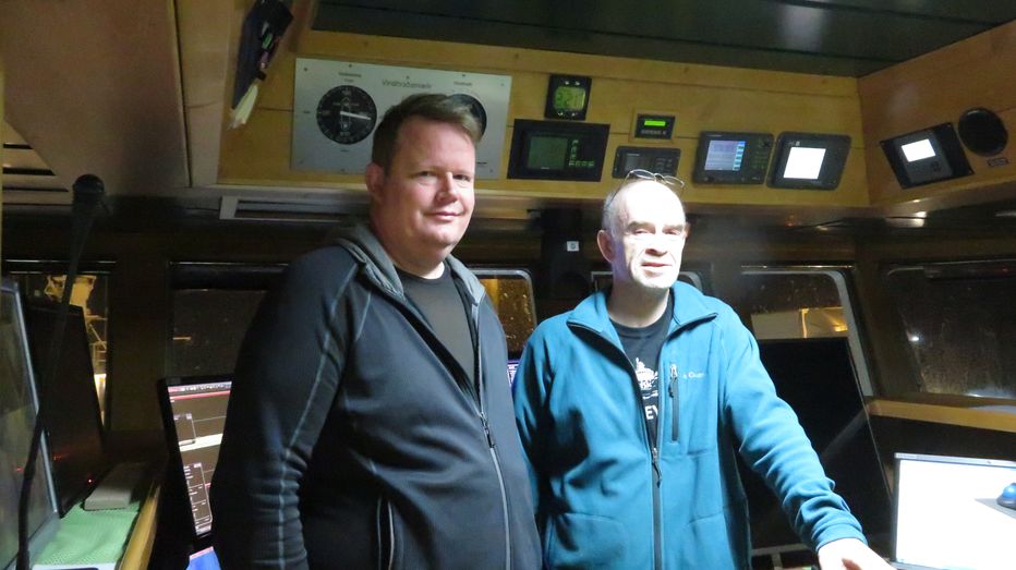 Garðar Jónsson stýrimaður til vinstri og Snorri Snorrason skipstjóri í brúnni á Pálínu Þórunni GK