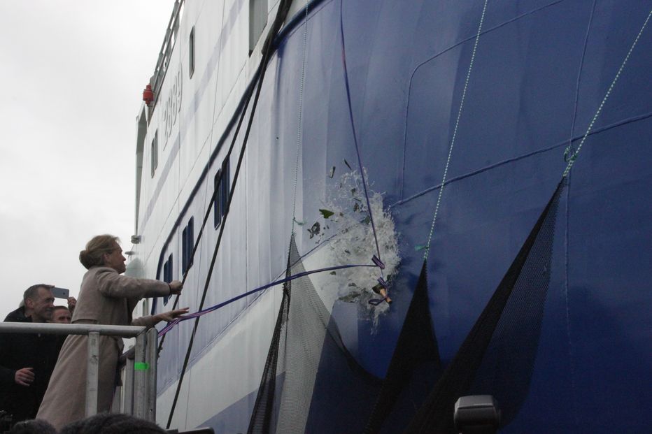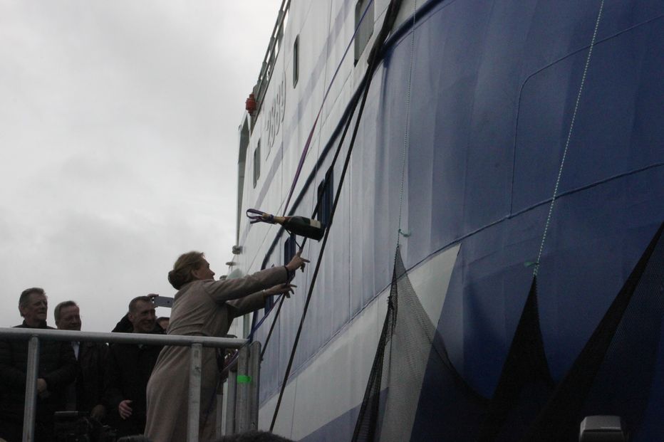 Þorgerður Katrín sjávarútvegsráðherra  smellti kampavínsflösku á skipið